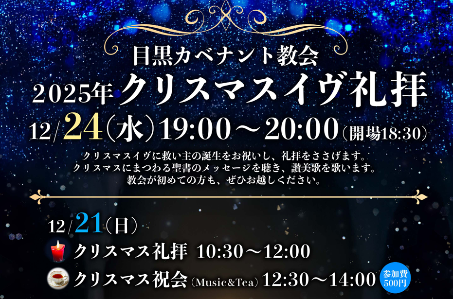 | 2025年12月24日(水) クリスマスイヴ礼拝 19:00~20:00 メッセージ: 聖書の箇所: ライブ配信: YouTubeに移動します |